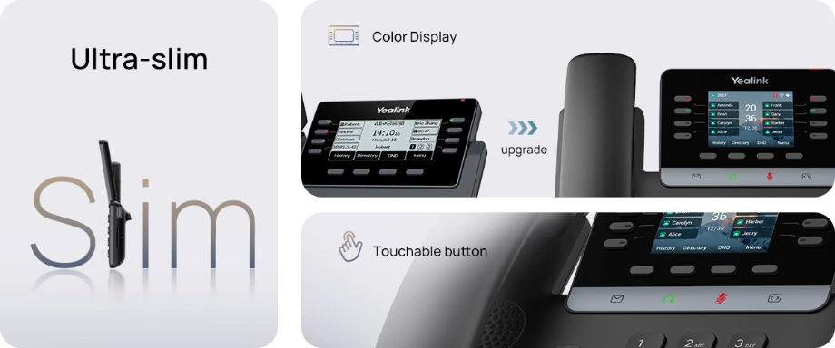 The Yealink SIP-T73W is a modern, Wi-Fi-enabled desk phone designed for professionals who want a fashionable, compact solution with reliable performance and flexible connectivity. Featuring a slimmer body, 2.8-inch color display with backlight, touchable buttons, and a stand with two adjustable angles, the T73W offers a comfortable, contemporary look and feel suitable for any workspace.