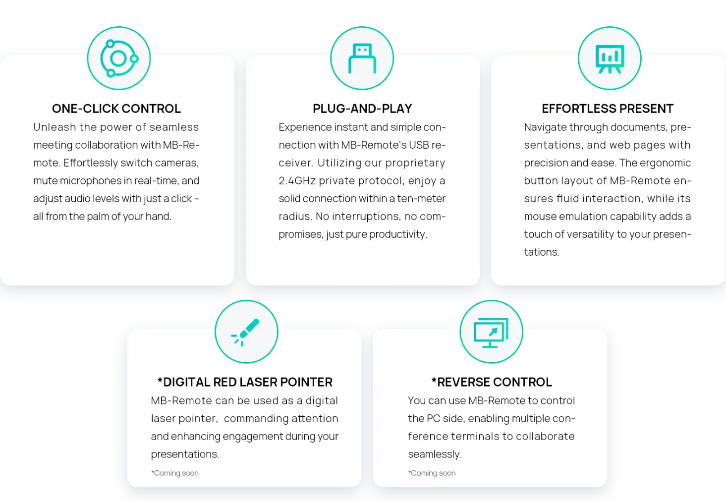It's not just a remote, it's your gateway to seamless presenting. Specially designed for Yealink conference terminals, MB-Remote empowers you to navigate your presentations effortlessly, ensuring a smooth flow and precise interactions with your audience during meetings.